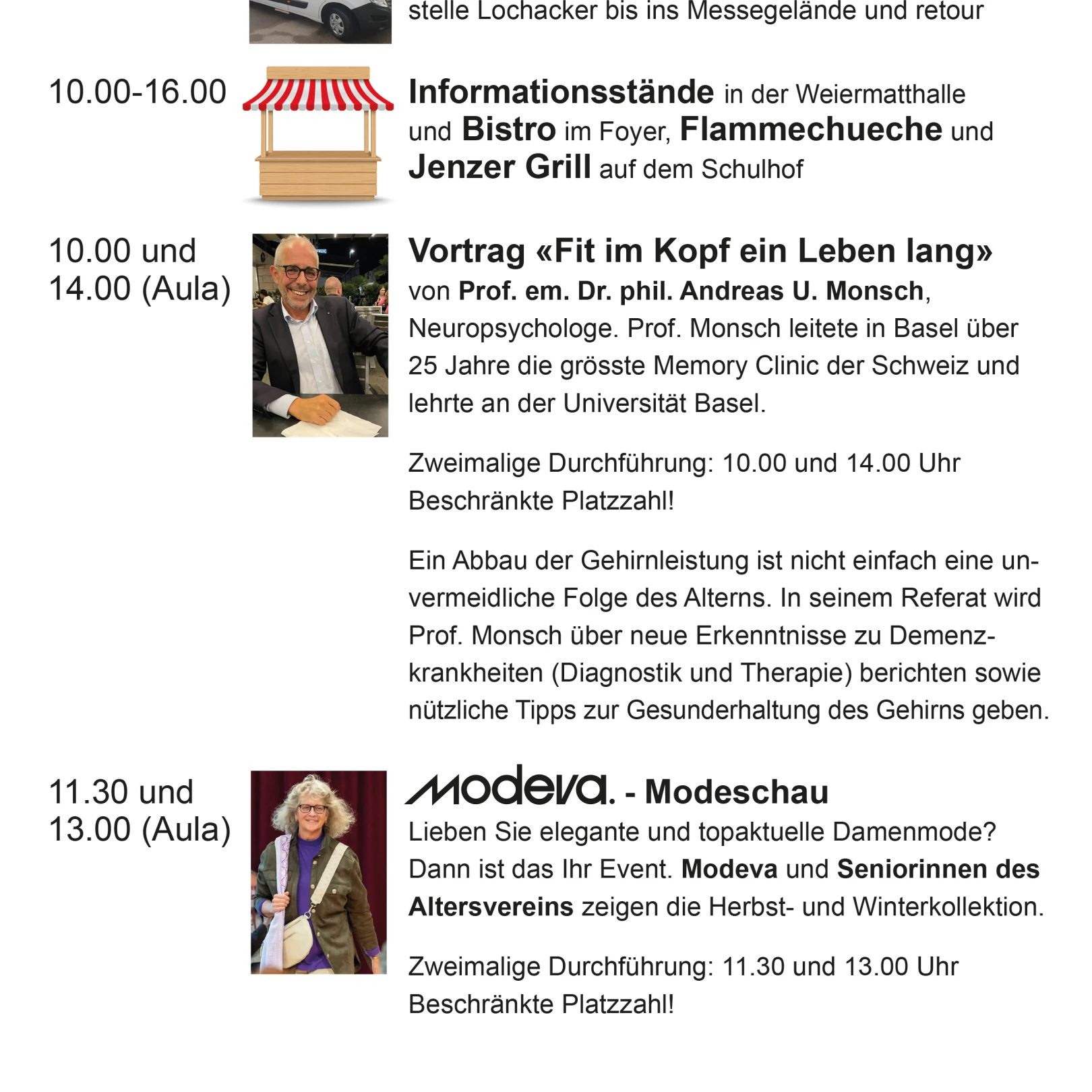 Der Anlass findet am Samstag, 8. November 2025 von 10.00 Uhr bis 16.00 Uhr in der Weiermatthalle in Reinach statt. In der Halle präsentieren Vereine, Organisationen und Firmen ihre Dienstleistungen und Angebote an. In der angrenzenden Aula werden Vorträge und Demos zum Thema “Fit im Kopf" ein Leben lang” und eine Modenschau angeboten. Im Foyer gibt es eine Cafeteria.